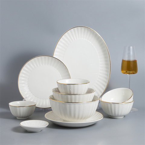 2025高級セラミック食器セット高品質磁器食器ゴールドリム付きエンボス加工皿と家庭用プレート